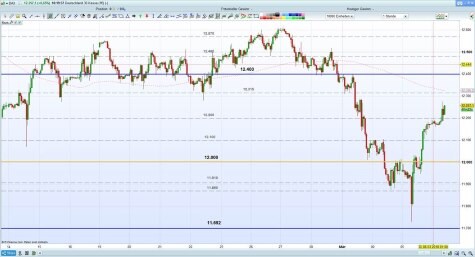 Der DAX handelt derzeit deutlich oberhalb der Unterstützung von 12.200 Punkten. Die weitere Erholung könnte bis in den Widerstandsbereich bei 12.315 Punkte laufen ohne den seit Ende Februar gültigen tertiären Abwärtstrend zu gefährden. Erst darüber hinaus würde sich weiteres Aufwärtspotential bis in den Unterstützungsbereich bei 12.480/12.570 ergeben. Die nächsten Unterstützungen liegen bei 12.200 und 12.100 Punkte .