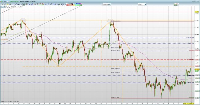 Deutlich besser als erwartete Zahlen zur deutschen Industrieproduktion haben den DAX heute Morgen zusätzlich geholfen jedoch scheiterte die Aufwärtsbewegung zunächst am Widerstand (R1) der heutigen Pivot Punkte.