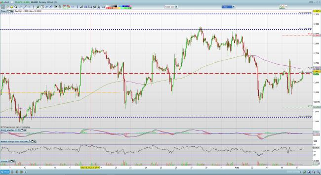 Sollte der DAX den Widerstandsbereich zwischen 12.650/12.670 Punkten nach oben durchbrechen könnte zunächst ein Test des gestrigen Tageshochs bei 12.720 Punkten anstehen. Darüber hinaus sollte in der Widerstandszone zwischen 12.750 und 12.770 Punkten erhöhter Verkaufsdruck entstehen. Nach unten sollte das gestrige Tagestief bei 12.535 Punkten als Intraday Unterstützung dienen.