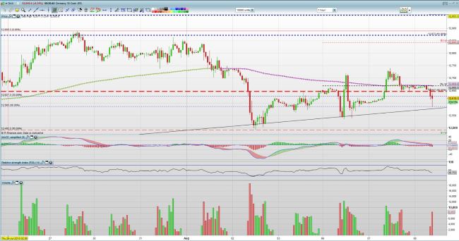 Nachdem es der DAX gestern nicht geschafft hat den Widerstand bei 12.750 Punkten zu überwinden fiel der deutsche Leitindex zunächst wieder in den Widerstandsbereich bei 12.650/12.670 Punkten. Heute Morgen startet der DAX mit Abschlägen in den Handelstag und notiert derzeit knapp über der Unterstützung bei 12.600 Punkten. Knapp darunter verläuft bei 12.575 Punkten eine kurzfristige Aufwärtstrendlinie (Jul/Aug Bewegung) welche den Markt nur kurz aufhalten dürfte. Kritisch wird das charttechnische Bild erst bei Unterschreiten der Unterstützung bei 12.500 Punkten. Hier könnte eine Anschlussbewegung bis in den Bereich 12.400 Punkte hinein erfolgen wo auch das 61.8% Fibonacci Retracement Niveau der Juni-Juli Bewegung verläuft. Nach oben stehen die gleichen Widerstände wie am Vortag zur Disposition.