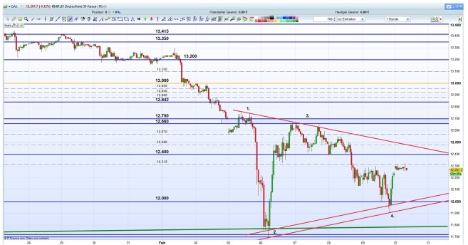 Der DAX fiel am späten Freitagshandel noch unter die psychologisch wichtige Marke von 12.000 Punkten, konnte sich aber erneut zügig vom Tagestief bei knapp über 11.900 Punkten erholen.