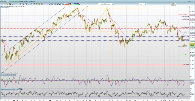 Nachdem der DAX gestern scharf bis knapp auf das Juni-Tief fiel, hat sich der Deutsche Leitindex nun leicht erholt und handelt bei 12.210 Punkten. Ein Bruch der Unterstützung im Bereich 12.100/12.120 dürfte einen Test der psychologisch wichtigen Marke von 12.000 Punkten bedeuten. Vergleicht man den DAX mit dem Dow Jones scheint letzterer in einer stärkeren Verfassung zu sein. Während der DAX sich vom gestrigen Abverkauf nur leicht erholt zeigt, handelt der Dow Jones in etwa auf dem Ausgangsniveau des Abverkaufs.