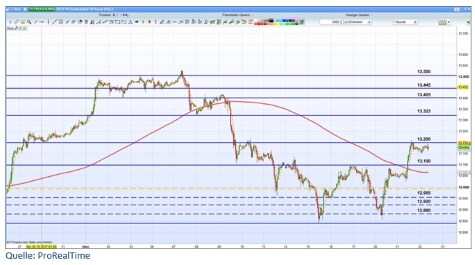 Mit einem erfolgreichen Ausbruch über die 13.200 Punkte könnte der DAX kurzfristig bis auf 13.250 und darüber hinaus bis auf 13.323 Punkte laufen. Nach unten könnte der Widerstand bei 13.100 Punkte seine Rolle wechseln und als neue Unterstützung dienen.