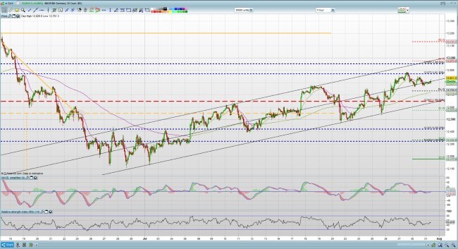 Nach unten besteht im DAX die Gefahr eines Bruchs des kurzfristigen Aufwärtstrends erst mit Unterschreiten der 12.650 Punkte Marke.