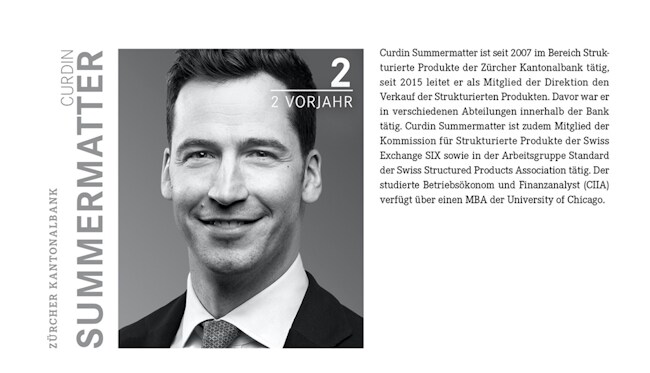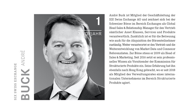 Neben den Marktdaten wird auch dieses Jahr wieder die Liste der «30 wichtigsten Köpfe» im Markt für Strukturierte Produkte präsentiert. André Buck, Global Head Sales & Relationship Manager der SIX Swiss Exchange AG, erhielt die meisten Stimmen und wurde zum wichtigsten Mann der Schweizer Derivatbranche gewählt. Auf den Plätzen zwei und drei folgen Curdin Summermatter, Head Sales Structured Products bei der Zürcher Kantonalbank und Georg von Wattenwyl, Global Head Structured Solutions Financial Institutions bei Vontobel und Präsident des Branchenverbands SSPA. Die grösste Positionsverbesserung gelang Jérôme Allet, Head Public Distribution for Structured Products Switzerland bei der UBS Investment Bank, und bester Neueinsteiger ist Erwin Naescher, Head of Sales Structured Products bei der Banque Cantonale Vaudois.