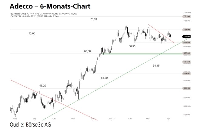 Rückblick: Seit Juli des vergangenen Jahres befinden sich die Aktien von Adecco in einer dynamischen Aufwärtsbewegung, die sich mit dem Ausbruch über den Widerstand bei 66,50 CHF zum Jahresanfang ausdehnte und den Wert über die Kurshürde bei 72,00 CHF antrieb.