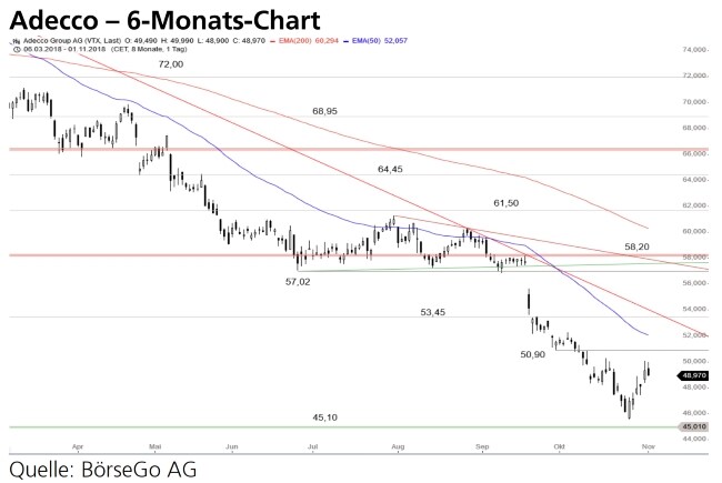 Rückblick: Im Rahmen ihres mittelfristigen Abwärtstrends unterschritten die Aktien von Adecco im April dieses Jahres die wichtige Unterstützung bei 66,50 CHF und generierten damit ein übergeordnetes Verkaufssignal.