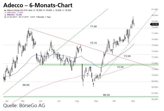Rückblick: Nach einer Bodenbildung an der 68,95 CHF-Marke setzten die Aktien von Adecco ihren mittelfristigen Aufwärtstrend fort und durchbrachen Ende September den Widerstand bei 75,10 CHF.