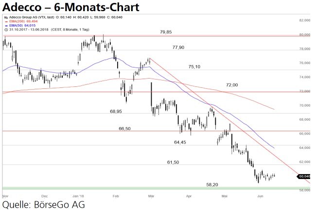 Ausblick: Die laufende Erholung ist im Vergleich zum Kurseinbruch der Vormonate nur ein Tropfen auf den heissen Stein. Zudem nimmt diese Seitwärtsbewegung aktuell bereits die Züge einer den Abwärtstrend bestätigenden Dreiecksformation an. Die Short-Szenarien: Die Bullen müssen zwingend das bisherige Jahrestief bei 59,04 CHF verteidigen, um die Ausbildung eines weiteren Verkaufssignals und einer entsprechenden Abwärtsbewegung zu verhindern. Aufgrund der derzeitigen Schwäche der Aktien von Adecco ist jedoch ein Bruch der Marke wahrscheinlich, der anschliessend auch zum Unterschreiten der langfristigen Unterstützung bei 58,20 CHF führen düre. In der Folge käme es kurzfristig zu Abgaben bis 55,00 CHF. Auf Sicht der kommenden Wochen düre der Wert allerdings bis 53,45 CHF einbrechen. Die Long-Szenarien: Sollte die 59.04 CHF-Marke dagegen verteidigt und der Widerstand bei 61,50 CHF überschritten werden, könnten die Aktien vorübergehend bis an die Hürde bei 66,50 CHF steigen. Die frühere Unterstützung düre die Ambitionen der Bullen jedoch einbremsen und dort eine weitere Abwärtsbewegung starten, die durchaus wieder bis 59,04 CHF führen könnte. Erst bei einem nachhaltigen Ausbruch über die Barriere wäre der Wert wieder aus der unmittelbaren Gefahrenzone und könnte bis 68,95 CHF klettern.