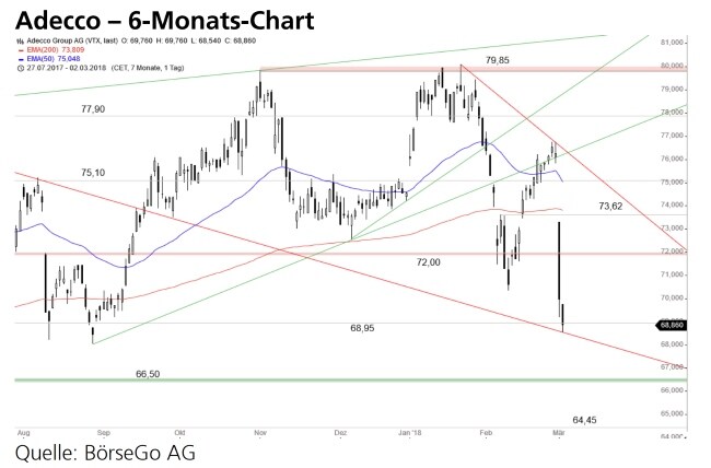 Zeit sein. Die Short-Szenarien: Fallen die Aktien von Adecco jetzt auch unter die Unterstützung bei 68,95 CHF zurück, würde