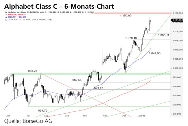 Rückblick: Im Oktober des vergangenen Jahres brachen die Aktien des Google Mutterkonzerns Alphabet über die damalige Rekordmarke bei 988,25 USD aus und generierten damit ein weiteres starkes Kaufsignal.