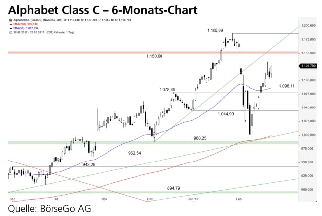Rückblick: Nach einer ausgeprägten Bodenbildungsphase von August bis September 2017 sorgte der Anstieg über die obere Begrenzungslinie eines Konsolidierungsdreiecks bei den Aktien der Google-Mutter Alphabet für einen charttechnischen Befreiungsschlag.