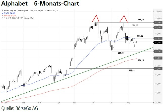 Ausblick: Der langfristige Aufwärtstrend bei den C-Aktien von Alphabet ist gefährlich nahe gerückt, auch wurde ein markantes Tief nur mit Mühe verteidigt. Überzeugend ist die Vorstellung der Bullen bislang nicht. Sie müssen in den kommenden Tagen zulegen. Die Long-Szenarien: Ein erster wichtiger Schritt wäre es, den kurzfristigen Widerstand in Form des Hochs bei 935,81 USD zu überwinden. In diesem Fall wäre eine kleine Bodenbildung abgeschlossen, welche weiteren Spielraum auf der Oberseite eröffnet. So wäre ein Anstieg in den Bereich um 971,00 USD möglich, zumal dort auch noch eine Kurslücke im Chart zu schliessen wäre. Erst wenn sich die Aktien aber über 988,25 USD etablieren können, wäre die Gefahr einer Trendwende im mittelfristigen Zeitfenster gebannt. Dann dürfte ein weiterer Angriff auf die runde Marke von 1.000 USD starten. Die Short-Szenarien: Verpufft die Erholung der vergangenen Tage dagegen und fällt der Wert zum einen unter das Tief bei 894,80 USD und zum anderen auch unter den knapp darunter verlaufenden langfristigen Aufwärtstrend, würde sich das Chartbild schlagartig eintrüben. Deutliche Kursverluste wären wohl die Folge, wobei die Kurslücken bei 874,25 und 842,88 USD die ersten Anlaufziele bilden.