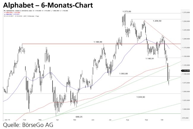 Rückblick: Noch im Juli führte der übergeordnete Aufwärtstrend die Aktien der Google-Muttergesellschaft Alphabet über das damalige Rekordhoch bei 1.186,89 USD und setzte sich mit einer steilen Kaufwelle fort.