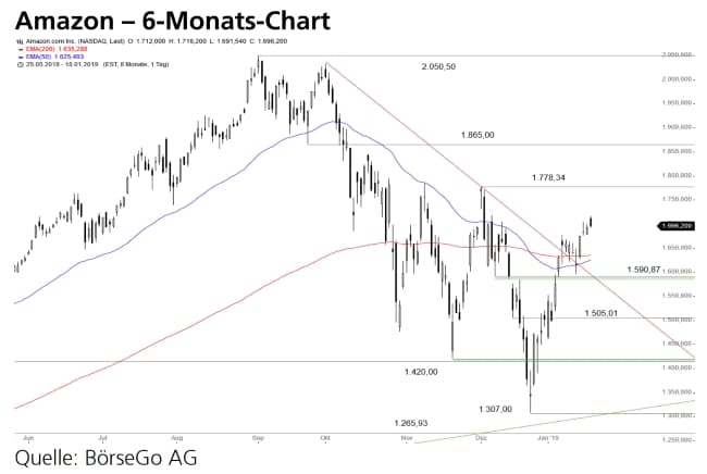 Rückblick: In den vergangenen Monaten mussten die Aktien von Amazon einen herben Kursrückschlag verkraften, der ausgehend von einem neuen Allzeithoch bei 2.050,50 USD zu einem Ausverkauf bis 1.307,00 USD führte.