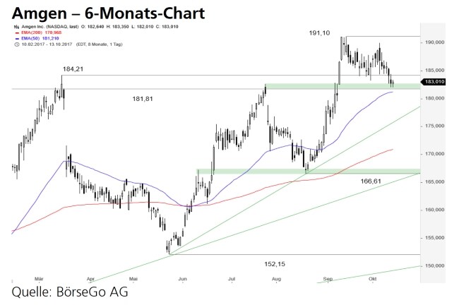 Rückblick: Seit Ende Mai dieses Jahres dominiert bei den Aktien des US-Biotechnologiekonzerns Amgen eine weitere dynamische Aufwärtsbewegung, deren erster Abschnitt bereits an den Bereich des Allzeithochs bei 184,21 USD aus dem März führte.