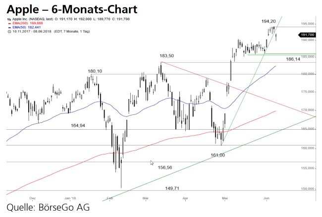 Ausblick: Die massive Rally bei den Aktien von Apple hat in der vergangenen Woche einen neuen Höhepunkt markiert. Dennoch ist der Wert kurzfristig deutlich überkau und damit korrekturanfällig. Der Rücksetzer der letzten Tage unterstreicht dies. Die Long-Szenarien: Oberhalb der kurzfristigen Unterstützung bei 186,14 USD ist der Aufwärtsimpuls seit Ende April intakt. An diese Haltemarke dürfte der Wert zunächst zurücksetzen und dort eine weitere Aufwärtsbewegung initiieren. Wird in ihrem Verlauf auch die 194,20 USD-Marke durchbrochen, könnte die Rally kurzfristig bis 200,00 USD führen. Oberhalb dieses charttechnischen Kursziels stünde eine Ausdehnung der Rally bis 205,00 und 207,00 USD auf der Agenda, ehe eine deutlichere Korrektur einsetzen düre. Die Short-Szenarien: Mit dem Hoch bei 194,20 USD könnte allerdings auch eine gleichförmige Bewegung beendet worden sein, deren erster Teil von der 150,24 USD-Marke im Februar bis zum Hoch bei 183,50 USD geführt hätte und der zweite am Tief bei 161,00 USD eingesetzt war. Damit könnte diese Trendphase abgeschlossen sein und eine deutliche Korrektur starten. Ein erstes Indiz hierfür wäre der Bruch der 186,14 USD-Marke. In diesem Fall wäre ein kurzfristiges Verkaufssignal aktiv und eine Gegenbewegung bis 180,10 USD die Folge. Dort könnte es zu einer weiteren Kaufwelle kommen. Abgaben unter die Marke würden dagegen für einen Einbruch bis 175,00 USD und mittelfristig bis 161,00 USD sorgen.