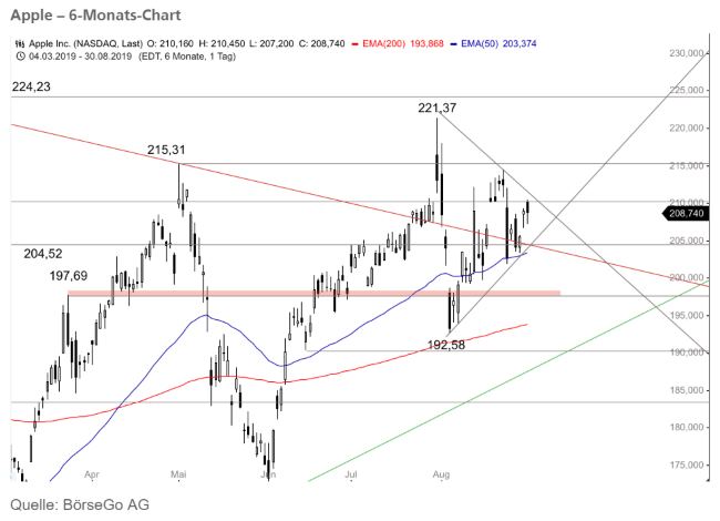 Ausblick: Im grossen Bild befinden sich die Aktien in einem Aufwärtstrend, der zunächst einmal bis zum Trendbruch Bestand hat und die weitere Richtung vorgeben sollte. Die Long-Szenarien: Sollten die Aktien weiter ansteigen können, dürfte das genannte symmetrische Dreieck in Trendrichtung nach oben aufgelöst werden. Ein Durchbruch nach oben im Bereich von 210,50 USD würde ein Kursziel bei etwa 240,00 USD generieren. Zudem hat Apple in der Vorwoche für den 10. September ein Event angekündigt, welches den Aktien weitere Aufwärtsdynamik verleihen könnte. Sollte das symmetrische Dreieck Bestand haben, dürfte ein möglicher Rücklauf hingegen schon um 205,40 USD an der unteren Begrenzung des Dreiecks auslaufen. Der Spielraum der Bären wäre also in diesem Fall begrenzt. Die Short-Szenarien: Sollten die Aktien hingegen aus dem symmetrischen Dreieck nach unten durchbrechen, und die Unterstützungszone zwischen 205,40 USD und 204,20 USD aufgeben, wäre zunächst ein erneuter Kursrückgang zum 50er-EMA bei 203,40 USD zu erwarten. Darunter würde wohl die Unterstützungszone um 197,70 USD angelaufen werden.
