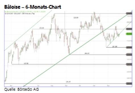 Ausblick: Die Erholung der Vorwoc hen stellte sich zuletzt als bearishe Flagge dar, welche bald eine zweite Korrekturwelle nach sich ziehen könnte . In diesem Fall besteht die Gefahr eines grossen Doppelhochs, währ end die Entwicklung innerhalb der Handelsspanne zwischen der 145,60 CHF- Marke und der 158,90 CHF-Marke noch neutra l bewertet werden könnte. Die Short-Szenarien: Zeigen sich nach dem leichten Bruch des mehrwöchigen Aufwärtstr ends weiter e Anschlussverkäufe, welche unter die 151,00 CHF-Marke führen, könnte ein Rückfall in Richtung der 147,90 CHF-Marke anstehen. Die 145,60 CHF-Marke dürfte im Zuge einer zweiten Abwärtswelle erreichbar werden, bevor dort eine grösser e Richtungsentscheidung möglich wird. Sollte Bâlose unter die 145,60 CHF-Marke fallen, würde dies ein Doppelhoch nach unten auflösen. Abgaben bis in den Bereich der 136,30 CHF-Marke könnten mittelfristig folgen, mit einem Zwischenziel an der 142,50 CHF-Marke. Die Long-Szenarien: Wenn es gelingt, sich im Bereich des kurzfristigen Aufwärtstr ends nach oben zu lösen, könnt e oberhalb der 153,90 CHF-Marke ein weiter er Anstieg zum gebrochenen Aufwärtstr end erfolgen. Zusammen mit der 158,90 CHF-Marke stellt dieser aber eine starke Wider- standszone dar. Erst darüber wird der Weg in Richtung der 170,00 CHF-Marke mittelfristig fr ei.