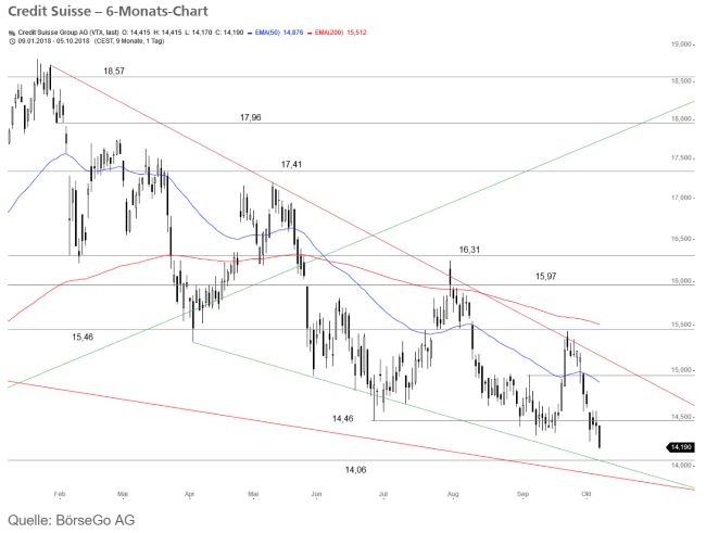 Rückblick: Bei den Aktien von Credit Suisse herrscht seit Jahresbeginn ein ausgeprägter Abwärtstrend vor, der ausgehend von einem Hoch bei 18,81 CHF bis Ende Juni auf 14,46 CHF geführt hatte.
