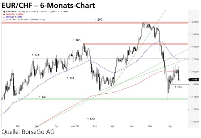 Rückblick: Nachdem das Devisenpaar EUR/CHF Anfang April auch über den Widerstand bei 1,183 USD ausbrechen konnte, setzte sich der Aufwärtstrend der letzten Jahre bis an die zentrale Kursbarriere bei 1,200 CHF fort.