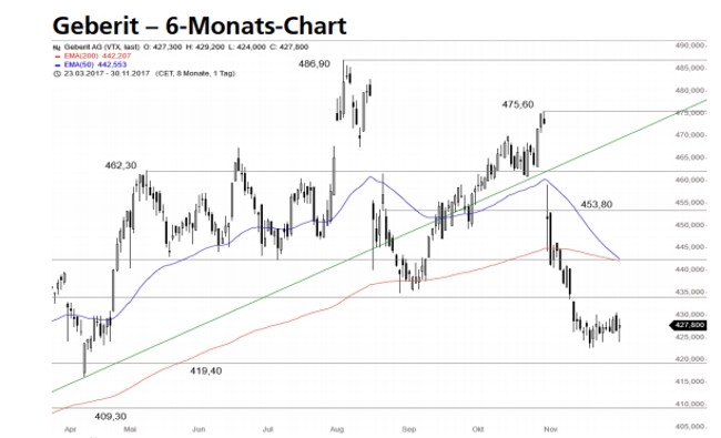 Rückblick: Mit dem Unterschreiten einer langfristigenAufwärtstrendlinie und dem anschliessenden Bruch derUnterstützung bei 462,30 CHF setzte sich eine Korrekturbewegungbei den Aktien von Geberit fort, die ihrenAusgang im August bei 486,90 CHF genommen hatte.