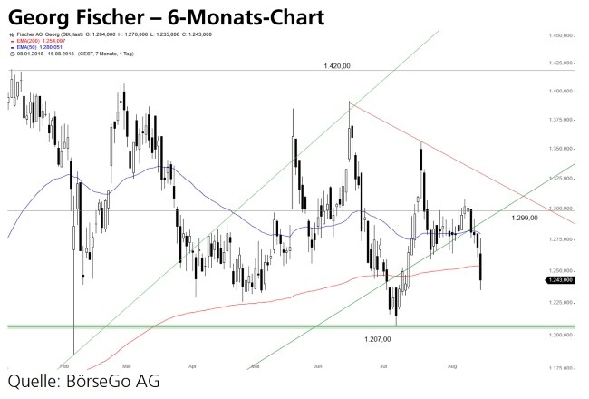 Rückblick: Nachdem die Aktien von Georg Fischer im Februar dieses Jahres zum zweiten Mal am neuen Allzeithoch bei 1.420,00 CHF nach unten zurücksetzt waren, setzte sich eine weitere Korrektur in Gang, die den Wert bis an den Bereich der markanten Unterstützung bei 1.207,00 CHF zurückfallen liess.