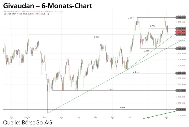 Rückblick: Für die Aktien von Givaudan ging es in den vergangenen Monaten wieder klar nach oben, nachdem eine steile Korrekturwelle im Februar 2018 auf der Unterstützung bei 2.025 CHF gestoppt wurde.