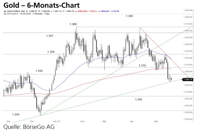 Rückblick: Nachdem die Bullen bei Gold Anfang April ein weiteres Mal an der Widerstandsmarke bei 1.366 USD gescheitert waren, setzte der Kurs des Edelmetalls unter eine kurzfristige Aufwärtstrendlinie und in der Folge an die wichtige Unterstützung bei 1.310 USD zurück.
