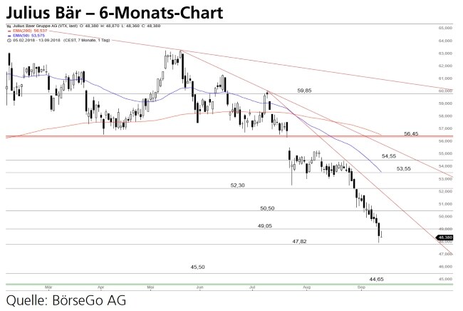 Rückblick: Ende Juli unterschritten die Aktien von Julius Bär die Unterseite einer Dreiecksformation, die mit der wichtigen Unterstützung bei 56,45 CHF zusammenfiel und bildeten damit ein mittelfristiges Verkaufssignal aus.
