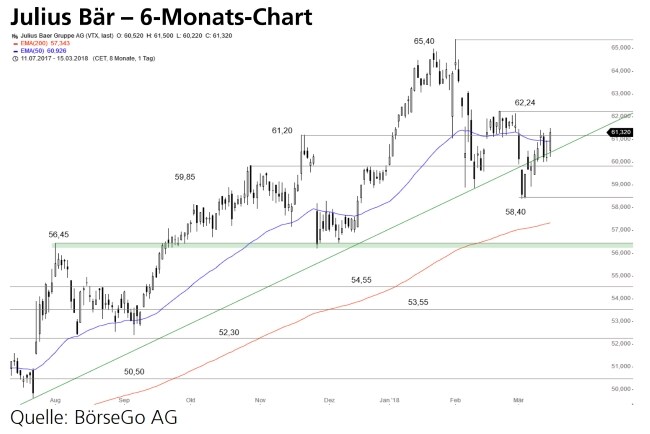 Rückblick: Nach einem bullishen Rücklauf an den im September 2017 überschrittenen Widerstand bei 56,45 CHF setzte sich der übergeordnete Aufwärtstrend bei den Aktien von Julius Bär zunächst fort und führte in der Spitze auf ein neues Rallyhoch bei 65,40 CHF, welches Anfang Februar markiert wurde.