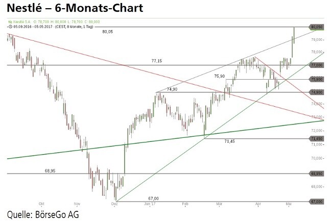 wichtigen Widerstand bei 80,05 CHF ein Rücksetzer möglich. Sollte Nestlé dabei unter die 79,00 CHF-Marke fallen, wäre auch eine deutlichere Zwischenkonsolidierung bis zur Unterstützung bei 77,15 CHF möglich. Der in diesem Bereich ebenfalls verlaufende Aufwärtstrend dürfte zusätzlich stützen. Wird die 77,15 CHF-Marke jedoch nochmals unterschritten, besteht die Möglichkeit einer Korrekturwelle bis zur 74,90 CHF-Marke.