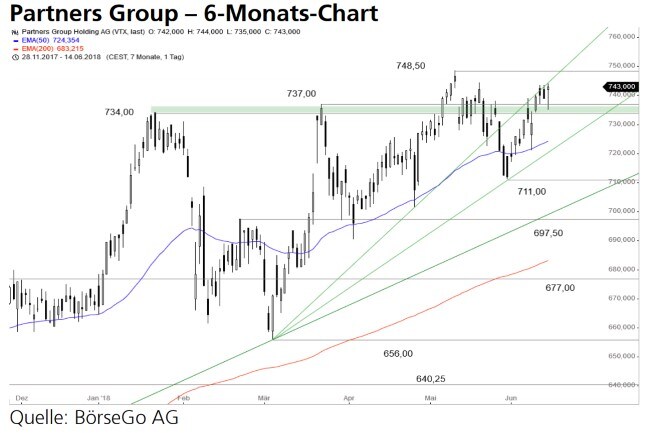 Rückblick: Mit dem Ausbruch über das damalige Rekordhoch bei 677,00 CHF bildeten die Aktien von Partners Group im Januar ein weiteres Kaufsignal aus, dem ein Anstieg bis 734,00 CHF folgte.