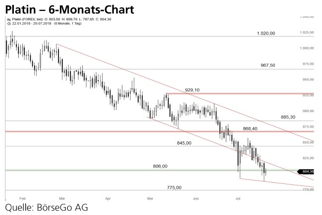 Rückblick: Mit dem Unterschreiten der wichtigen Unterstützung bei 967,50 USD endete bei Platin im Februar dieses Jahres eine steile kurzfristige Erholung und der übergeordnete Abwärtstrend setzte sich in den folgenden Monaten mit neuer Dynamik fort.