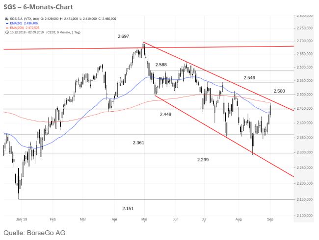 Ausblick: Wenngleich sich die Entwicklung seit dem August-Tief sehen lassen kann, ist von einem mittelfristigen Befreiungsschlag bei den Aktien von SGS bislang noch nicht auszugehen. Doch stärkere Kaufsignale sind gar nicht mehr so weit entfernt. Die Long-Szenarien: Als wichtige naheliegende Widerstände fungieren der Abwärtstrend seit April bei aktuell rund 2.480 CHF und knapp darüber erneut die horizontale Barriere bei 2.500 CHF. Werden diese beiden Marken überschritten, hätten die Käufer ein Ausbruchssignal generiert. Das erste Ziel lässt sich in diesem Fall bei 2.546 CHF festmachen. Dort könnte der Wert wiederum etwas konsolidieren. Sammeln die Käufer genug Kraft, um auch die Hürde bei 2.546 CHF zu überschreiten, würde sich das Chartbild weiter verbessern. Bei 2.588 CHFläge eine weitere Horizontale im Chart, ehe der Titel das Jahreshoch bei 2.697 CHF ansteuern dürfte. Die Short-Szenarien: Bleiben die Widerstände bei 2.480 und 2.500 CHF dagegen intakt, dürften die Verkäufer einen Versuch starten, die Aktien unter die Unterstützung bei 2.449 CHF zu drücken. Gelingt dieses Vorhaben, wartet erneut bei 2.361 CHF eine extrem wichtige Unterstützung im Chart. Bricht auch sie, dürfte es für die Bullen schwer werden, weitere Jahrestiefs zu vermeiden. Es würde dann vielmehr der Ausverkauf auf 2.151 CHF drohen.