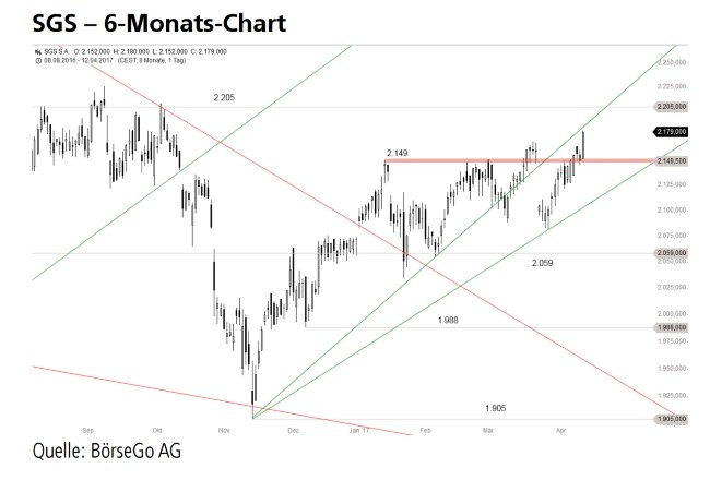 Rückblick: Ausgehend von einem Tief bei 1.905 CHF stiegen die Aktien von SGS in den letzten Monaten in einer soliden Aufwärtsbewegung an und überschritten Anfang Januar eine langfristige Abwärtstrendlinie.