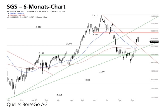 Rückblick: Ausgehend von einem Verlaufstief bei 1.905 CHF im November 2016 stiegen die Aktien von SGS in den folgenden Monaten über den Widerstand bei 2.208 CHF und markierten im Juni ein Hoch bei 2.412 Punkten.