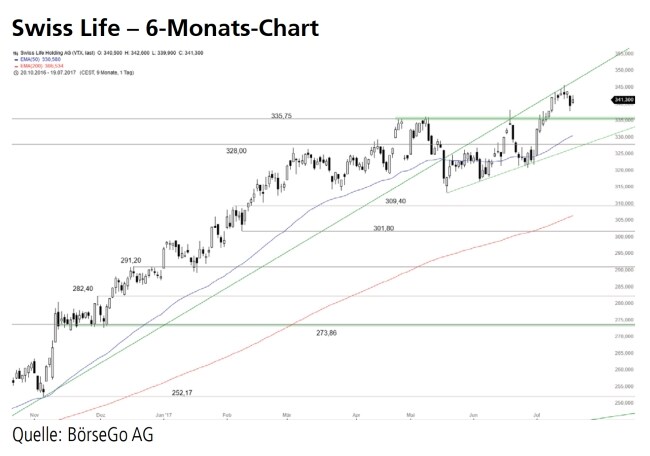 Rückblick: Die Aktien von Swiss Life erreichten Ende April dieses Jahres den langfristigen Widerstand bei 335,75 CHF und setzten dort zu einer kurzen Korrektur an.