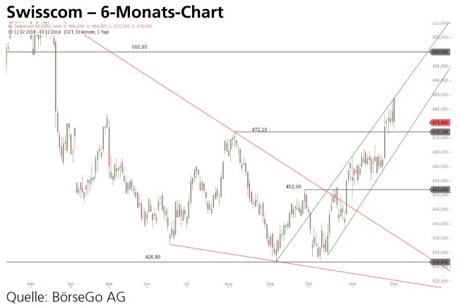Swisscom den bei 466,00 CHF liegenden Aufwärtstrend bald