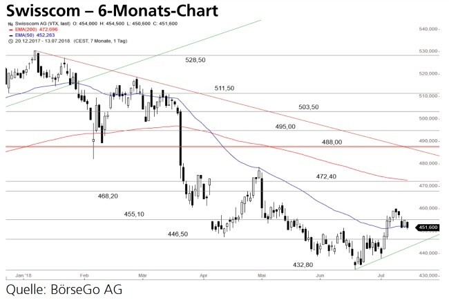 Rückblick: Ende März beschleunigte sich eine ohnehin schon steile Abwärtsbewegung bei den Aktien von Swisscom nach dem Bruch der Unterstützung bei 503,50 CHF zusätzlich und sorgte für einen Ausverkauf bis an die Haltemarke bei 446,50 CHF.