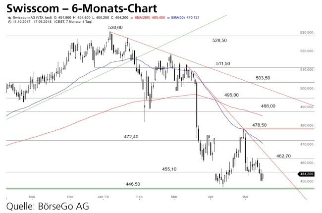 Rückblick: Nach einem gescheiterten Ausbruchsversuch über den Widerstand bei 528,50 CHF setze bei den Aktien von Swisscom im Januar dieses Jahres eine Trendwendephase ein, die mit dem Bruch der Unterstützung bei 511,50 CHF abgeschlossen wurde.