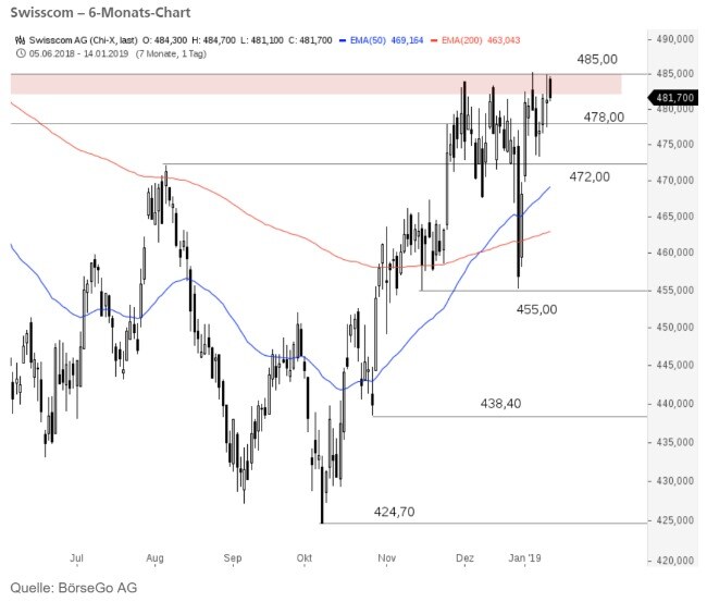 Ausblick: In der vergangenen Woche erreichten die Aktien von Swisscom bei 485,30 CHF ein neues Mehrmonatshoch. Dieses Hoch müssten die Investoren aus dem Markt nehmen, um weiteres Erholungspotenzial zu generieren. Die Long-Szenarien: Sollte der Titel in den kommenden Tagen auf Wochensicht über der 485,00 CHF-Marke schliessen, würde ein neues Kaufsignal entstehen. Das Erholungspotenzial wäre allerdings zunächst stark begrenzt, denn bei 500,00 CHF würden die Wertpapiere auf ihre Abwärtstrendlinie von 2014 treffen. Daher dürften an dieser runden Marke zunächst Gewinnmitnahmen stattfinden. Anschliessend könnte sich die Erholung allerdings noch bis knapp 530,00 CHF fortsetzen. Die Short-Szenarien: Scheitern die Marktteilnehmer erneut an der Widerstandszone bei 485,00 CHF, wäre ein Rücksetzer bis 455,00 CHF wahrscheinlich. Würden die Aktien dort keinen Halt finden, dürfte sich die Korrekturbewegung bis 438,40 CHF fortsetzen. Ein Rückfall unter diese Unterstützung würde den Weg frei machen für ein neues Verlaufstief unter 424,70 CHF.