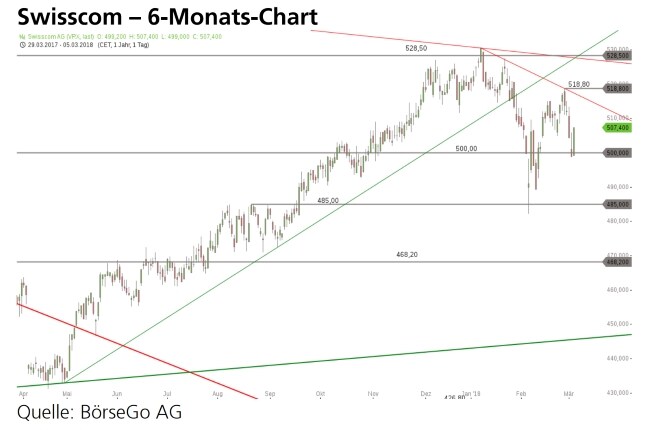 Swisscom nochmals unter die 500,00 CHF-Marke rutschen,