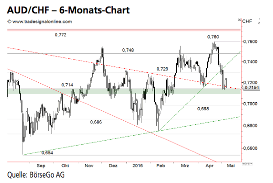 Der derzeitige Verlauf des Währungspaares AUD/ CHF ist aus unserer Sicht bearish zu werten, da der Ausverkauf nach dem erneuten Fehlausbruch über 0,748 CHF extrem steil verläuft. Dennoch haben die Bullen noch eine Chance, sich gegen einen drohenden Ausverkauf zu wehren. Die Short-Szenarien: Sollte es den Käufern jetzt gelingen, die 0,714 CHF-Marke zu verteidigen, wäre eine Erholung bis an den Widerstand bei 0,729 CHF die Folge. Dort sollten die Bären allerdings erneut zuschlagen und den Wert diesmal unter die 0,714 CHF-Marke ausverkaufen. Damit wäre ein bearishes Signal generiert und eine Verkaufswelle bis 0,698 CHF und darunter bereits bis an die Unterstützung bei 0,686 CHF wahr - scheinlich. Sollte die Marke ebenfalls durchbrochen werden, käme es zur Fortsetzung des Abwärtstrends bis an die 0,682 CHF-Marke. Die Long-Szenarien: Schaffen es die Käufer da - gegen, AUD/CHF wieder über die frühere Unterstützung bei 0,729 CHF zu hieven, könnte sich eine vorübergehende Erho - lung entwickeln und das Paar bis an den zentralen Widerstand bei 0,748 CHF zurückbefördern. Oberhalb dieser Marke würde bereits wieder das Jahreshoch bei 0,760 CHF in den Blickpunkt der Anleger rücken. Dort sollte man sich jedoch auf entsprechende Gegenwehr der Bären einstellen.
