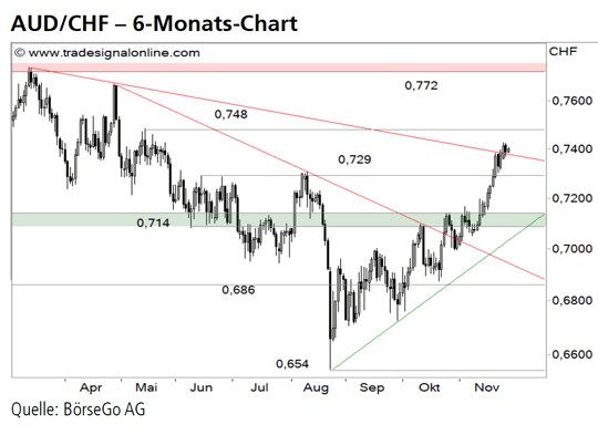 Rückblick: In der KeyInvest Daily Markets Analyse vom 13.11. wiesen wir auf kurzfristig positive Signale bei AUD/USD hin. Und tatsächlich, in den vergangenen Tagen zog das Währungspaar deutlich an.