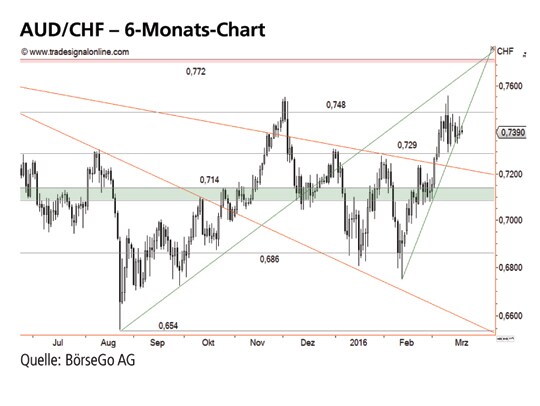 Ausblick: Die Bullen haben das Währungspaar AUD/CHF aktuell fest im Griff. Es fehlt nicht mehr viel und der Wert könnte sich in Richtung der Hochs vor dem SNB-Einbruch aufmachen. Die Long-Szenarien: Nach einem erfolgreichen Test der Haltemarke bei 0,729 CHF könnte AUD/CHF direkt wieder an den Widerstand bei 0,754 CHF klettern. Ein Ausbruch über dieses Verlaufshoch würde zu einem Kaufsignal führen, das den Wert weiter in Richtung 0,772 CHF-Marke antreiben dürfte. Diese Barriere könnte eine stärkere Gegenbewegung nach sich ziehen. Doch im Anschluss sollten die Bullen die aktuelle Aufwärtsdynamik nutzen und auch diese Marke überschreiten. Damit könnte der Wert mittelfristig bis 0,811 CHF haussieren. Gelingt den Bullen sogar der Anstieg über diesen Widerstand, würde bereits die 0,848 CHF-Marke in greifbare Nähe rücken. Die Short-Szenarien: Setzt AUD/CHF dagegen unter 0,729 CHF zurück, könnte der nächste Ausbruchsversuch über 0,754 CHF nur über den Umweg einer Korrektur bis 0,714 CHF starten. Diese Marke sollte von der Käuferseite allerdings verteidigt werden. Andernfalls müsste man von einem vorzeitigen Ende der Kaufwelle und einem mehrwöchigen Rücksetzer bis an die wichtige Haltemarke bei 0,686 CHF ausgehen.
