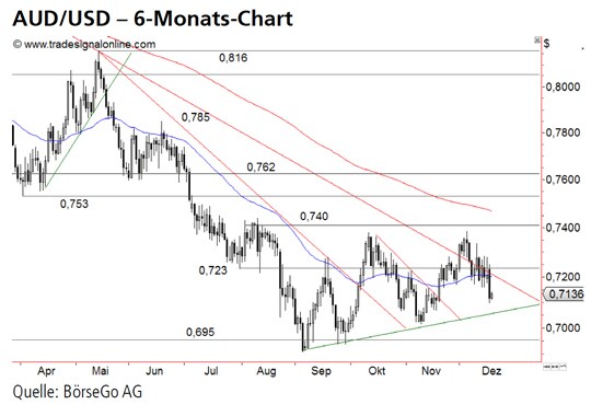 Ausblick: Die Käufer vergeben aktuell die Chance, beim Währungspaar AUD/USD eine mittelfristige Trendwende einzuleiten. Insbesondere der gestrige Handel hat aufgezeigt, wie stark die Übermacht der Bären derzeit ist. Die Short-Szenarien: Unterhalb der Widerstandsmarke bei 0,723 USD bleibt das Paar angeschlagen und die Fortsetzung der Baisse wahrscheinlich. Sollte der Wert jetzt auch unter die kurzfristige Aufwärtstrendlinie zurückfallen, käme es zu weiteren Verlusten bis an die wichtige Haltemarke bei 0,695 USD. Dort könnten die Bullen einen weiteren Stabilisierungsversuch starten. Scheitert dieser und setzt AUD/USD anschliessend auch unter diese Unterstützung zurück, wäre ein weitreichendes Verkaufssignal aktiviert. Kurzfristig dürfte das Paar in der Folge bis 0,680 USD einbrechen. Auf mittlere Sicht könnte es sogar zu einem Ausverkauf bis 0,660 USD kommen. Die Long-Szenarien: Bei einer Rückeroberung der 0,723 USD-Marke wäre zwar eine kurze Erholung bis 0,740 USD möglich, allerdings dürfte diese Barriere weitere Abgaben auslösen. Zu einem übergeordneten Kaufsignal würde es erst bei einem dynamischen Anstieg über diesen Widerstand kommen. Allerdings hätten die Bullen damit auch eine mittelfristige Bodenbildung erfolgreich abgeschlossen und eine weitreichende Trendwende eingeleitet. Ein erstes Ziel dieses Kaufsignals läge bei 0,762 USD.