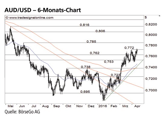 Ausblick: Der neue Aufwärtstrend hat AUD/USD über wichtige Kurshürden ausbrechen lassen und damit den Weg nach Norden frei gemacht. Eine letzte Hürde muss jetzt noch überwunden werden, um den Kursanstieg fortzusetzen. Die LongSzenarien: Oberhalb der kurzfristigen Haltemarke bei 0,762 USD hat das Paar jetzt die Gelegenheit, über das bisherige Verlaufshoch bei 0,772 USD auszubrechen. Dies würde eine dynamische Kaufwelle bis 0,785 USD nach sich ziehen. Dort könnte eine leichte Korrektur einsetzen. Wird die Hürde durch einen weiteren Aufwärtsimpuls ebenfalls überschritten, könnte das Paar bis 0,806 USD steigen. Selbst ein Angriff auf das frühere Korrekturhoch bei 0,816 USD wäre damit denkbar. Die Short-Szenarien: Wird die 0,762 USD-Marke dagegen im weiteren Verlauf unterschritten, könnte eine Gegenbewegung zurück an die 0,753 USD-Marke führen. Dort hätten die Bullen die Chance, das Paar zu stabilisieren und zu einem weiteren Ausbruchsversuch über 0,772 USD anzusetzen. Wird die Unterstützung von den Bären durchbrochen, sollte sich die Korrekturphase zunächst bis an die Haltemarke bei 0,738 USD ausdehnen. Dort müssten die Käufer allerdings wieder aktiv werden, um einen Ausverkauf bis 0,723 USD zu vermeiden.