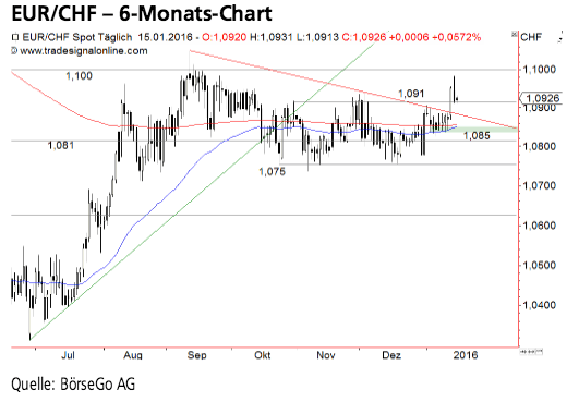 Dort setzte eine Korrektur ein, die das Paar an die Unterstützung bei 1,075 CHF zurückführte. Die Marke wurde von den Bullen mehrfach erfolgreich verteidigt und zum Jahreswechsel zum Ausgangspunkt für eine dynamische Aufwärtsbewegung. Zuletzt überwanden die Bullen bereits eine mittelfristige Abwärtstrendlinie und den Widerstand bei 1,091 CHF.