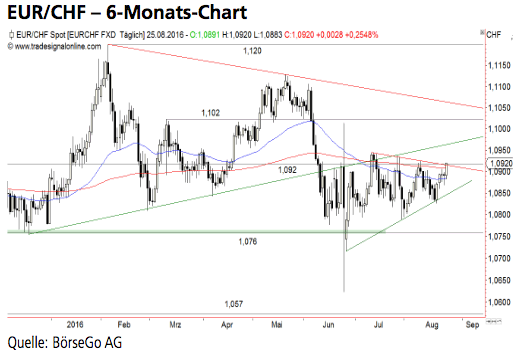 Rückblick: Beim Währungspaar EUR/CHF wurde mit dem Rückfall unter die 1,102 CHF-Marke bereits Anfang Juni ein Verkaufssignal generiert, welches bis zur Unterstützung bei 1,076 CHF führte. Während des Brexit-Referendums konnte die Käuferseite diesen Kursbereich zeitweise nicht mehr verteidigen.